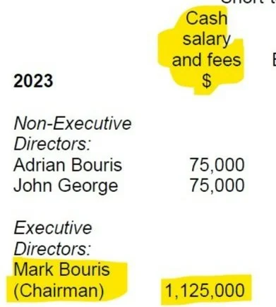 As mentioned earlier, Mr Bouris is paid $1,125,000 for his role as Executive Chairman, specifically, he’s paid to his corporate vehicle, Golden Wealth Holding Pty Ltd. This was contracted for another three years in FY23.